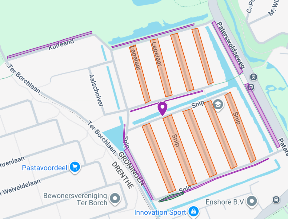 Bij de groene scheg krijg je ook nadere instructies over waar en hoe je het beste kunt planten. Het lijkt ons handig als de mensen zo verdeeld worden over de wijk dat ze bollen kunnen planten in de buurt van hun woning. Onderstaande plattegrond heeft in paarse kleur weer welke gebiedjes we geschikt vinden voor het planten van bollen. De oranje/rode kleuren in de Lepelaar en Snip geven aan waar we de bollen NIET zullen planten.